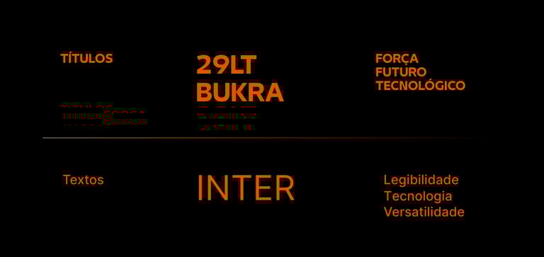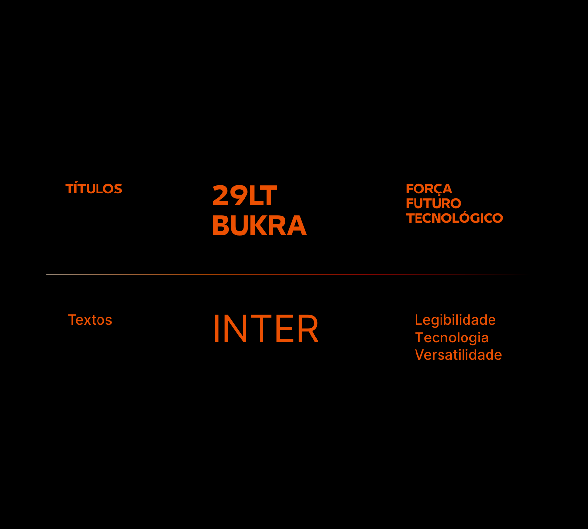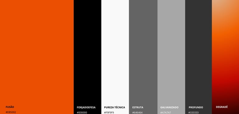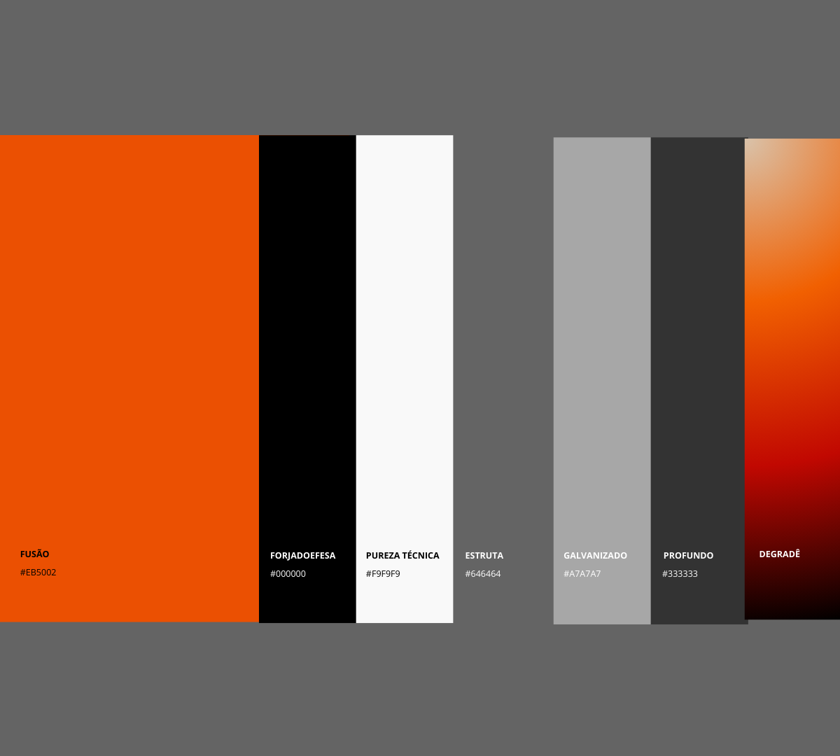 A paleta foi pensada para equilibrar energia e solidez. O laranja funciona como a cor de destaque: representa movimento, transformação, foco em oportunidade e dinamismo nas operações. É ele que dá personalidade e memorabilidade à marca.