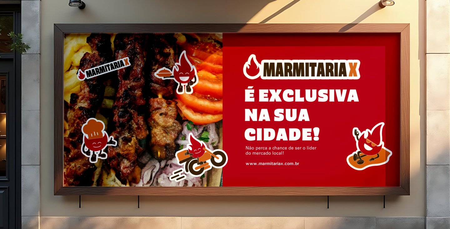 O resultado final é uma marca clara em sua proposta, visualmente forte, fácil de entender e preparada para escalar. A Marmitaria X se posiciona como uma solução confiável, moderna e acessível, capaz de gerar valor real para restaurantes locais e de crescer de forma estruturada em todo o Brasil, mantendo consistência, reconhecimento e eficiência em diferentes contextos e regiões.