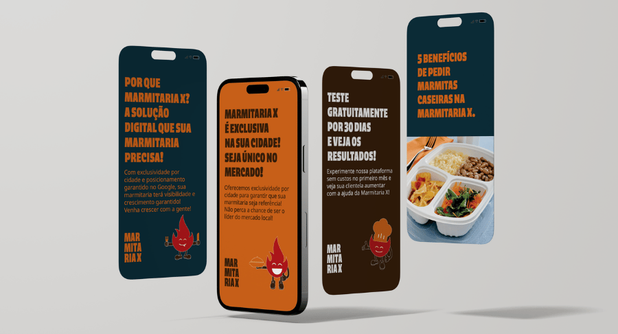 A Marmitaria X não é um delivery, nem uma agência. É uma plataforma que leva visibilidade, pedidos e crescimento real para marmitarias locais. Então, antes de qualquer decisão visual, foi definido o posicionamento estratégico da marca.