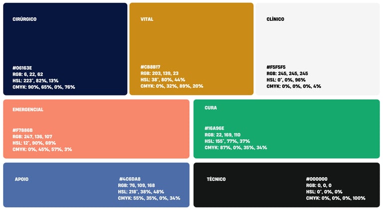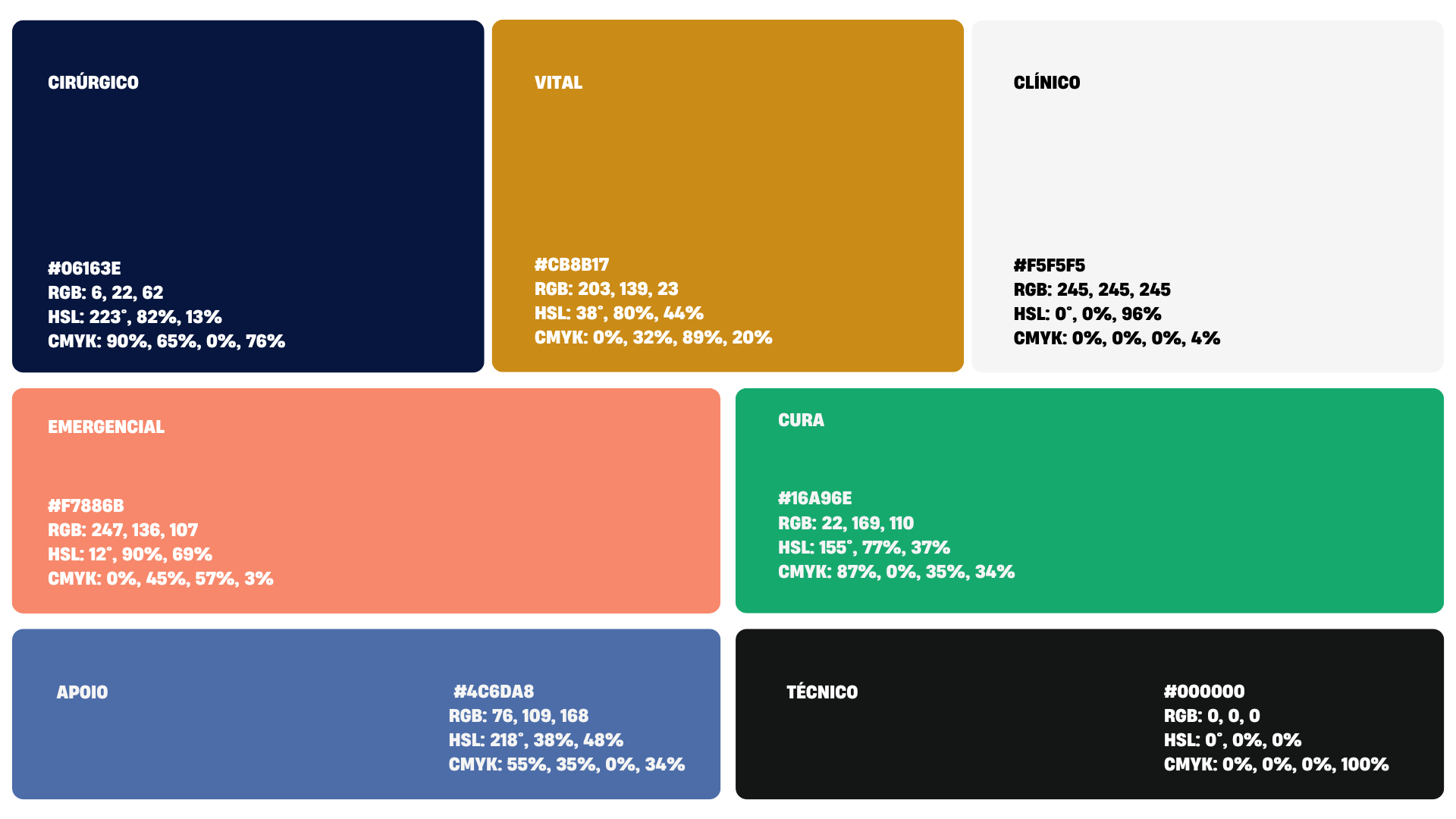 A paleta cromática equilibra tons profundos e técnicos com cores mais vibrantes e energéticas. Os azuis e tons escuros comunicam confiança, estabilidade e precisão médica, enquanto cores de apoio trazem dinamismo, vida e proximidade. Essa combinação permite que a marca transite com facilidade entre o ambiente técnico-clínico e a comunicação emocional com tutores.